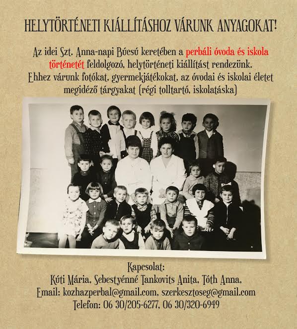 Az idei Szt. Anna-napi Búcsú idején a helyi óvoda és iskola történetét feldolgozó, helytörténeti kiállítást rendeznek Perbálon. Ehhez várnak a szervezők fotókat, gyermekjátékokat, az óvodai és iskolai életet megidéző tárgyakat (régi tolltartó, iskolatáska, stb).
