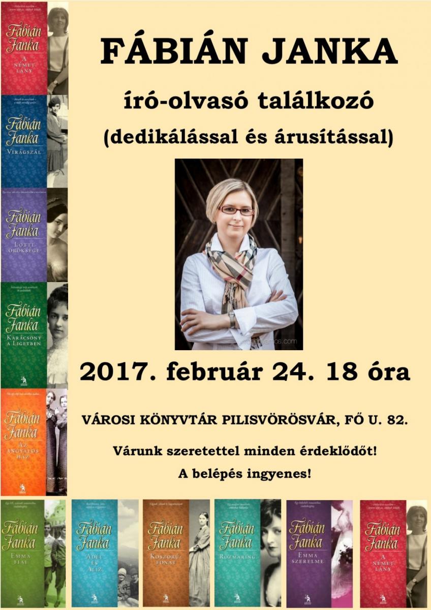 Február 24-én, pénteken 18 órától író-olvasó találkozót rendeznek Pilisvörösváron: az eseményen Fábián Janka írónővel találkozhatunk. A dedikálással és árusítással egybekötött beszélgetésre szeretettel várnak minden érdeklődőt a könyvtárba.
