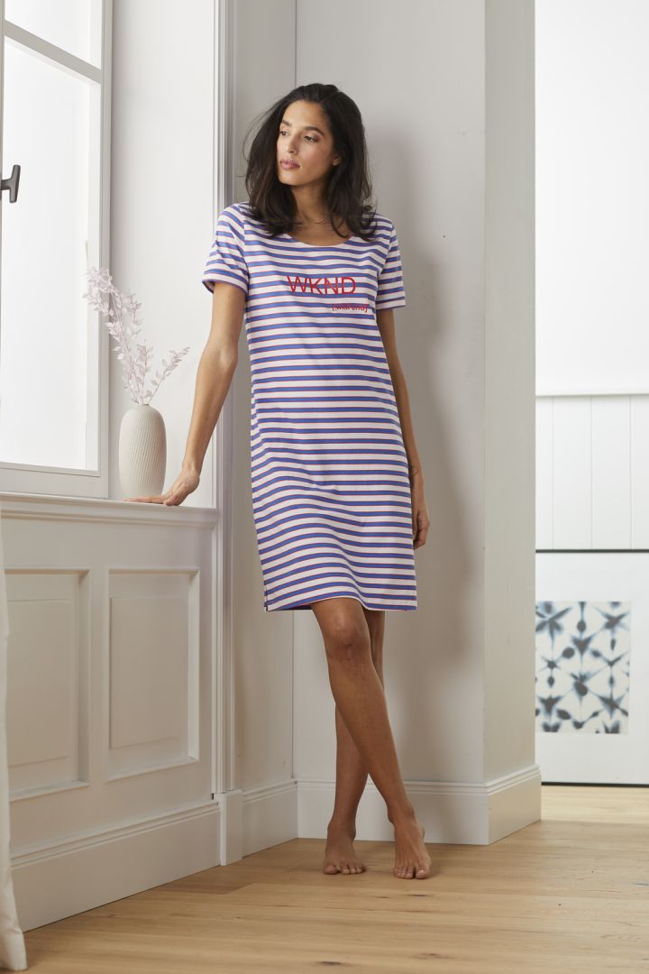 A kék-piros-fehér csíkozás jelenik meg a rövidujjú, kerek nyakkivágású, S-től XXL-es méretig kapható női hálóing esetén is, melynek anyag 95%-ban biopamutból áll, némi elasztánnal kiegészítve. A hálóing alsó szegélye enyhén lekerekített, oldalt pedig kis hasítékok találhatók rajta, hogy a bőrbarát anyagú darab lefekvés előtt és felkelés után is teljesen szabad mozgást biztosítson, így téve kellemesebbé nem csak az éjszakát, de a késő esti-kora reggeli időszakot is.