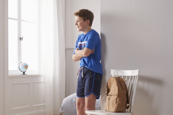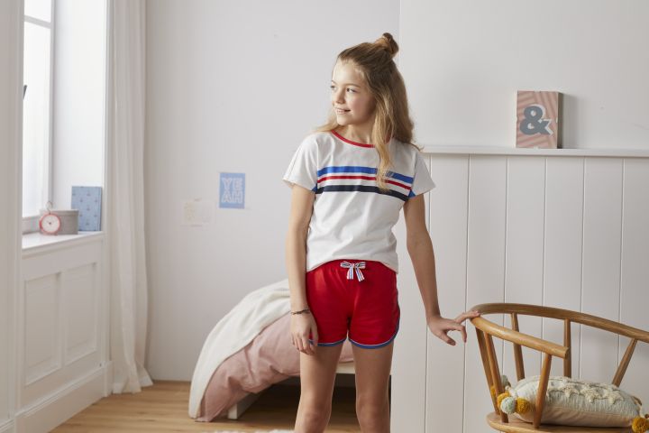 A család fiatalabb tagjai számára szintén találunk bőrbarát, tiszta biopamut anyagú hálóruhát: a fiú rövidnadrágos pizsama kék, a lány rövidnadrágos pizsama pedig piros-fehér színben érhető el, mindkét esetben 110/116-tól 170/176-os méretig. A fiú szett középkék felsőjéhez sötétkék alsó társul, míg a lány szettben fehér póló tartozik a piros rövidnadrághoz. Mindkét szett rövidujjú felsőjét vizszintes csíkok díszítik a mellrészen, a rövidnadrágok pedig kék szegéllyel, valamint piros-fehér-kék csíkos megkötővel készültek.