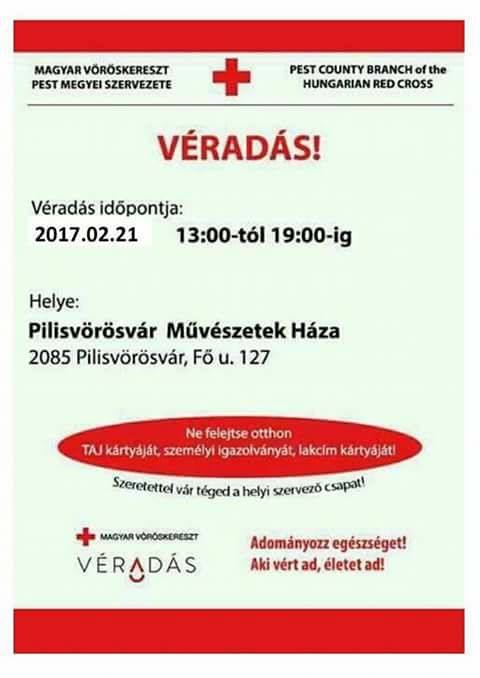 Február 21-én, kedden 13 és 19 óra között a Magyar Vöröskereszt helyi szervezete szeretettel várja a véradókat a Művészetek Házába. Ne felejtse otthon a TAJ kártyáját, személyi igazolványát és a lakcím kártyáját!