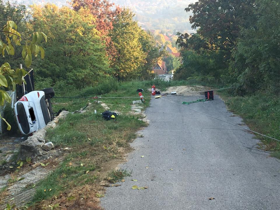 Október 9-én, kedden reggel kapta az értesítést a solymári tűzoltóság, miszerint Solymáron, a Móricz Zsigmond utcában egy autó árokba borult.