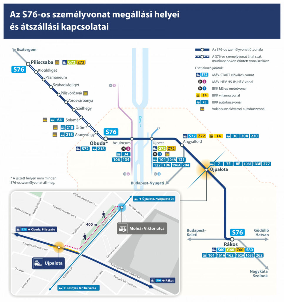A MÁV-START 2020 október végén indította el Rákos és Piliscsaba között közlekedő S76-os viszonylatát, mely új elővárosi és városon belüli kapcsolatokat hozott létre. Az észak-budai és a kelet-pesti agglomerációt összekötő járat fontos átszállási kapcsolatot biztosít a személyszállításba bevont külső körvasúton keresztül. Egyre többen ismerik a járat előnyeit, így a járványhelyzet ellenére is fokozatosan növekszik az utasok száma.